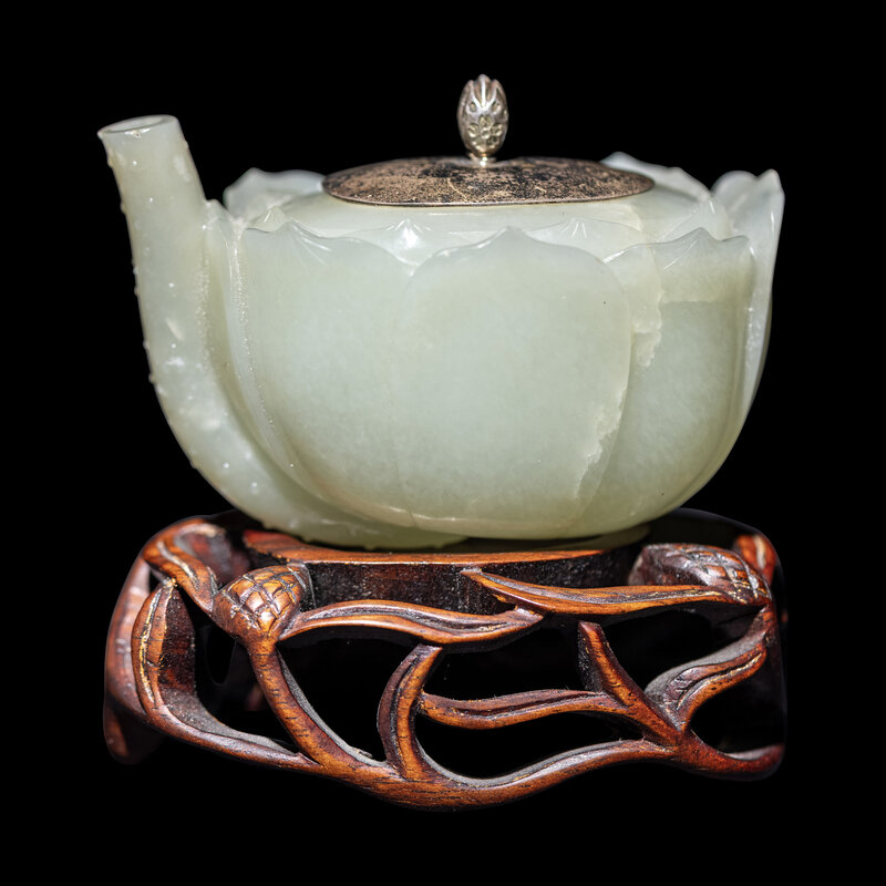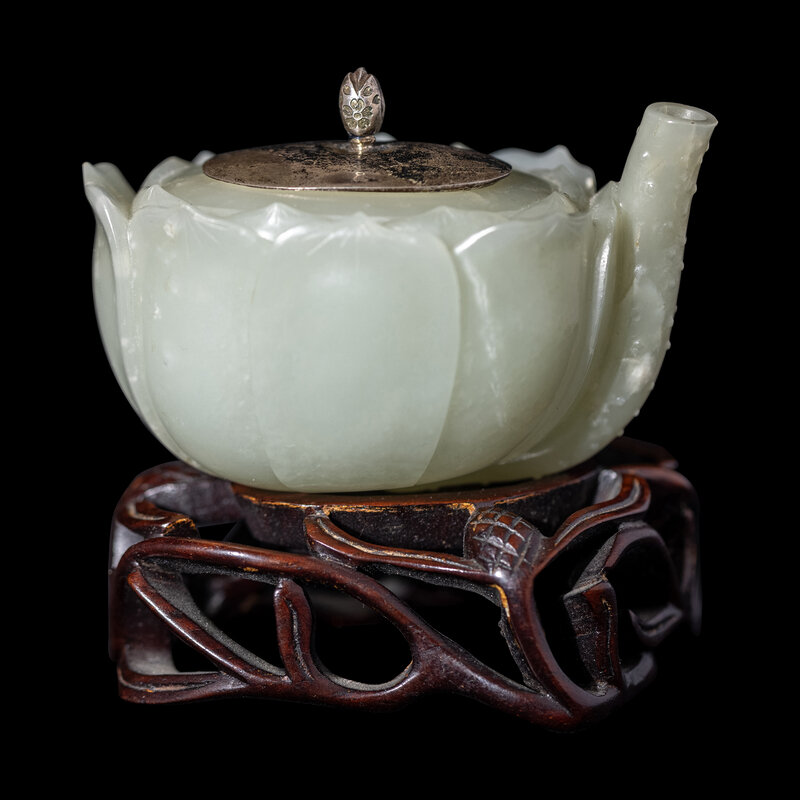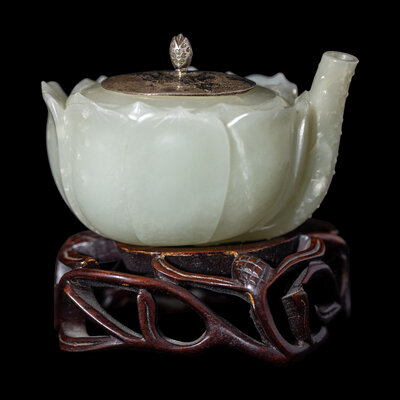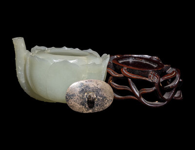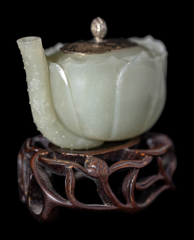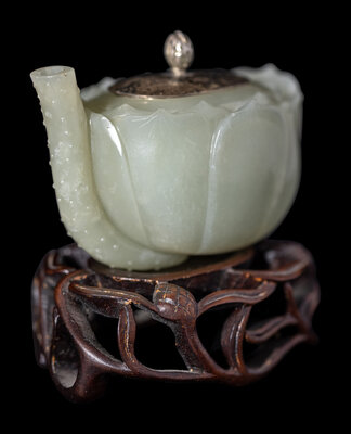 carved in the form of a lotus bud with a stem-shaped spout extended to the side, with a metal cover and wood stand.