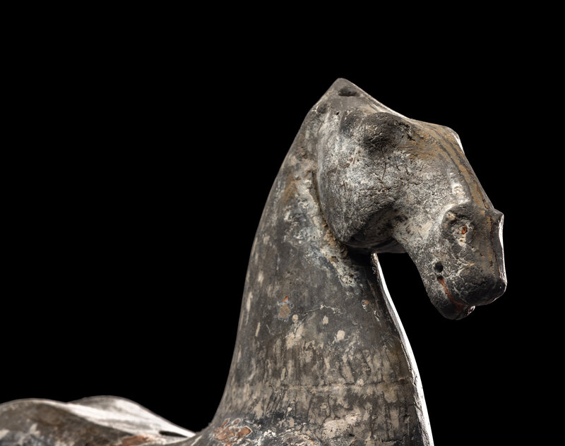 molded with an elongated sway back and rounded hindquarters, pierced for a bit between shaped lips, the grey body with traces of pigments at the agape mouth and flared nostrils.