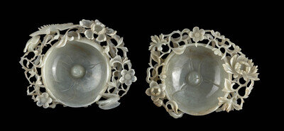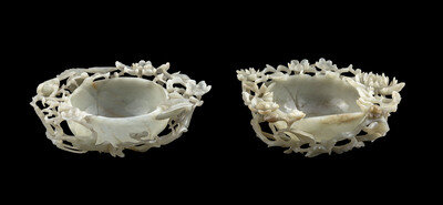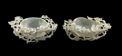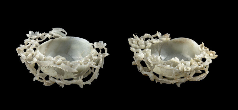 清中期 青白玉鏤雕花鳥紋花式洗一對