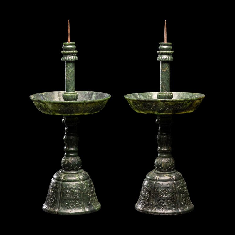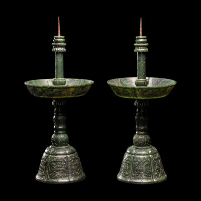 A Pair of Chinese Carved Spinach Jade Pricket Candlesticks