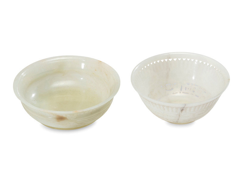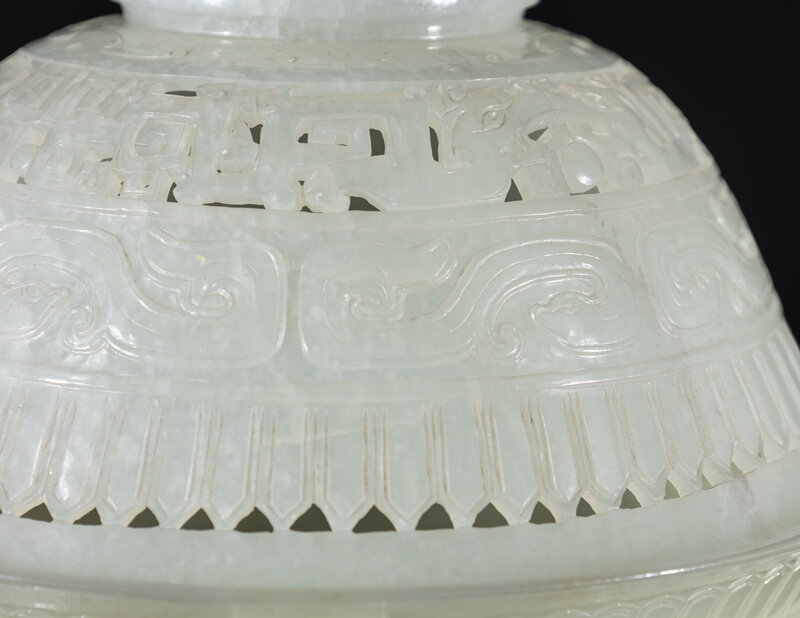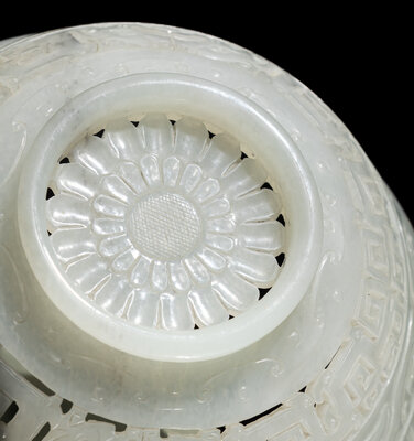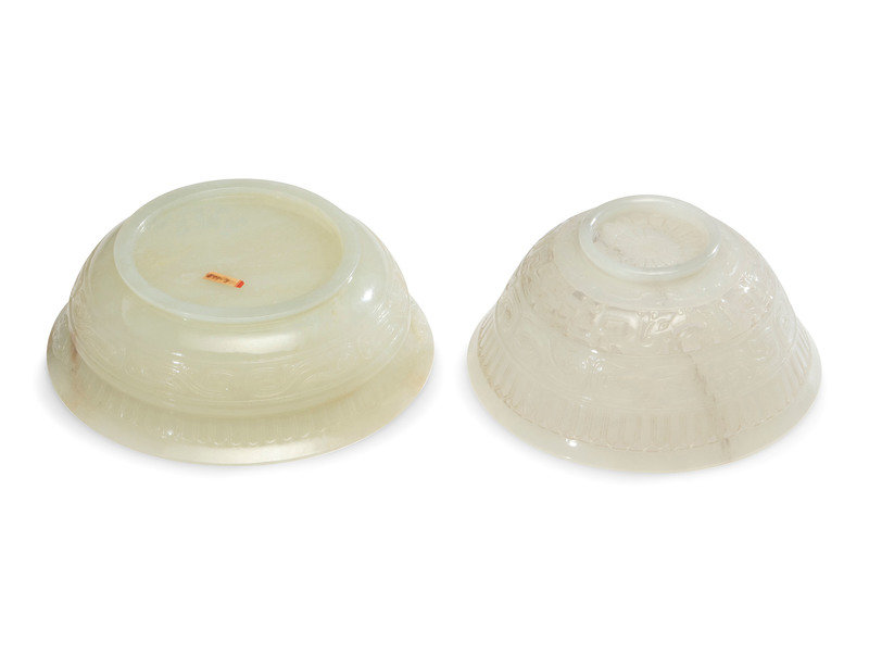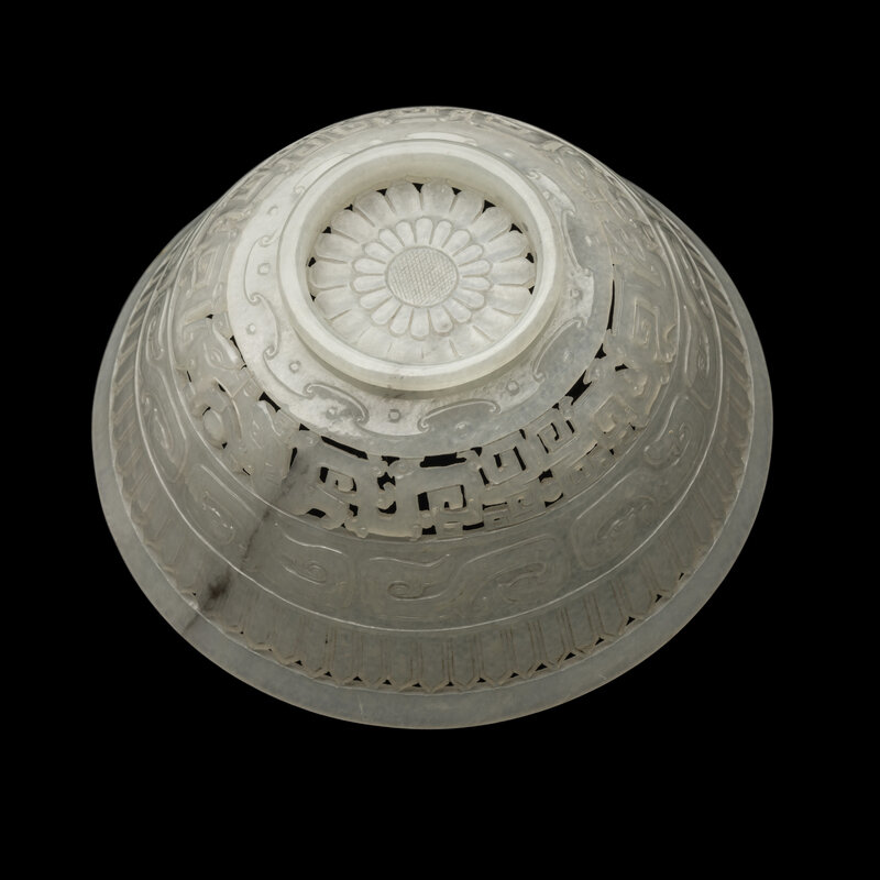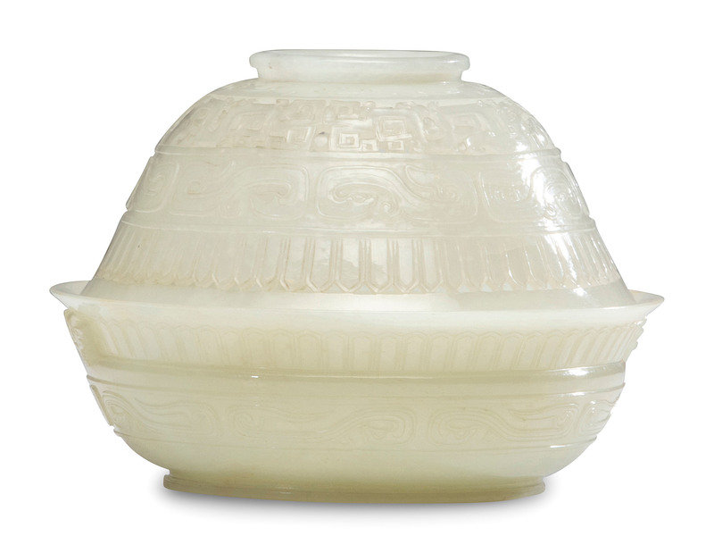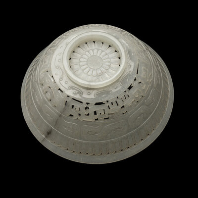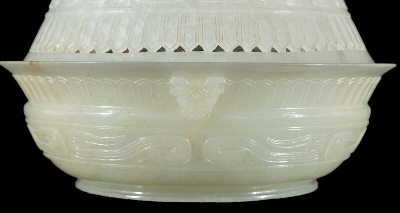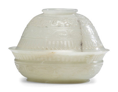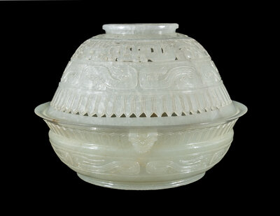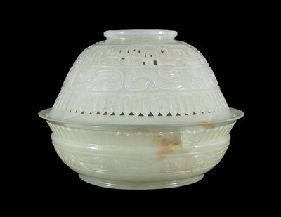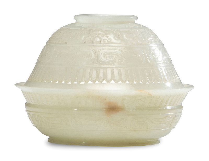 A Chinese Carved and Pierced 'Archaistic' White Jade Bowl and Cover