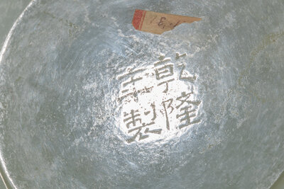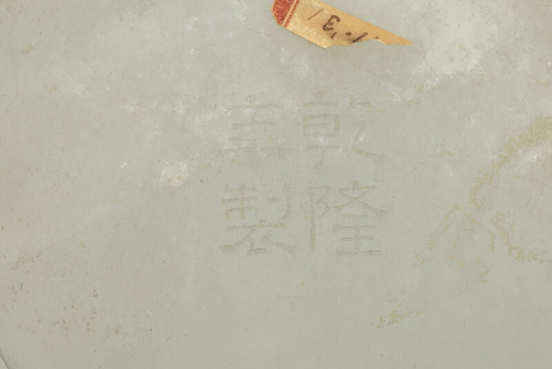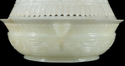supported on a straight foot, the low bowl carved in low relief with a band of dragons beneath upward pointed lappets, flanked at each side by horned beast-form handles. The conforming cover with high sides, with bands following the bowl beneath reticulated dragons encircling a flat central knob carved with chrysanthemum decoration, incised to the underside with a Qianlong mark, the pale stone with faint charcoal streaks and russet blushes.