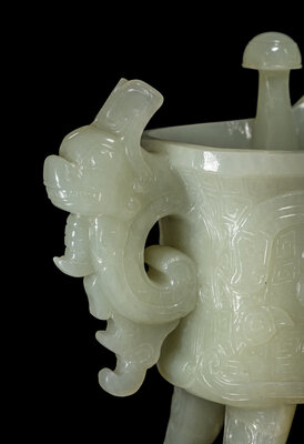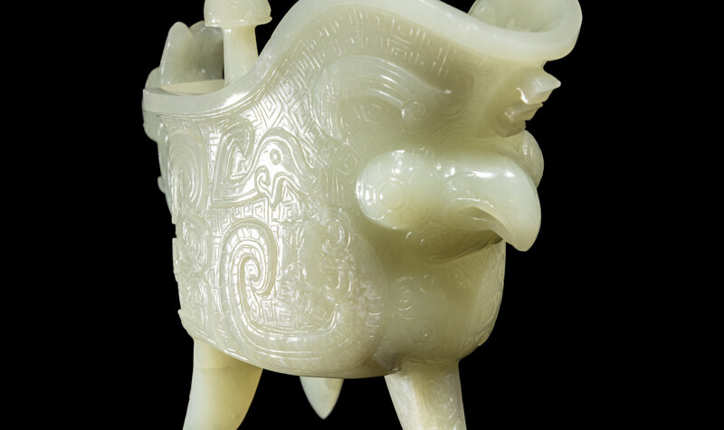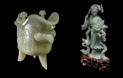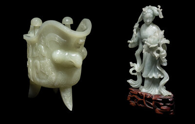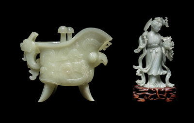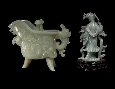 the first a celadon jade jue vessel, the second a small jadeite figure of a female immortal.