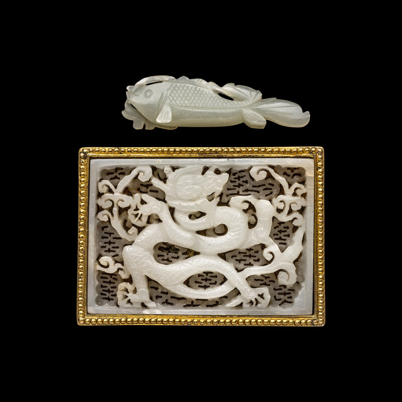 the first a Ming dynasty white jade 'dragon' plaque inset gilt mounted belt buckle, the second a 19th/20th century small jade figure of a fish.