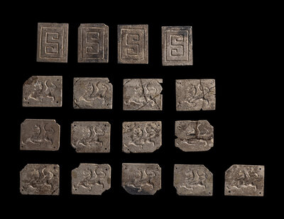each of rectangular form, 13 pieces carved to the center with a striding dragon, 4 incised with an s within a rectangular panel.
