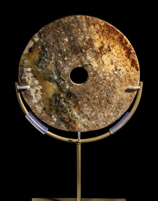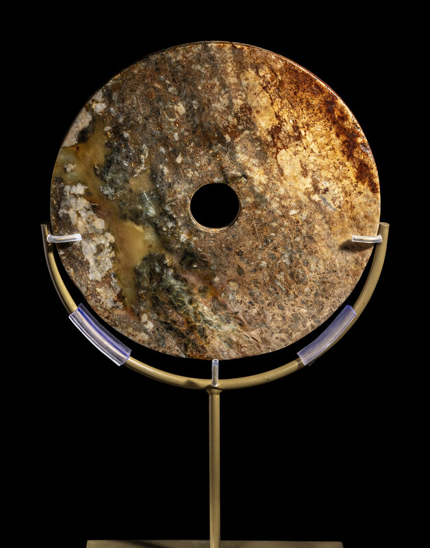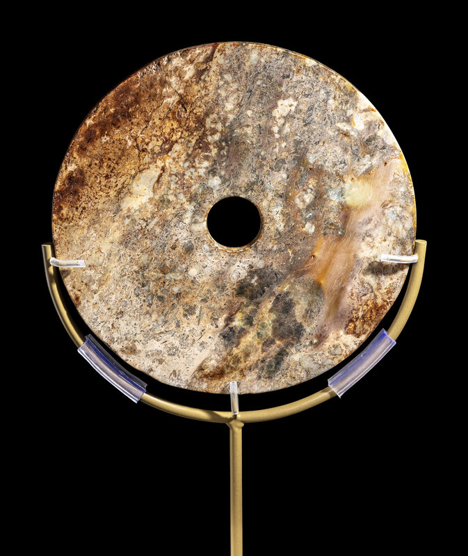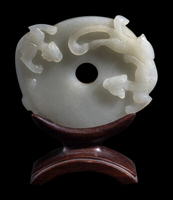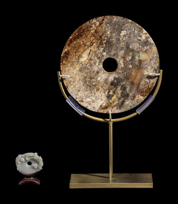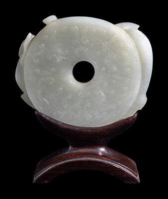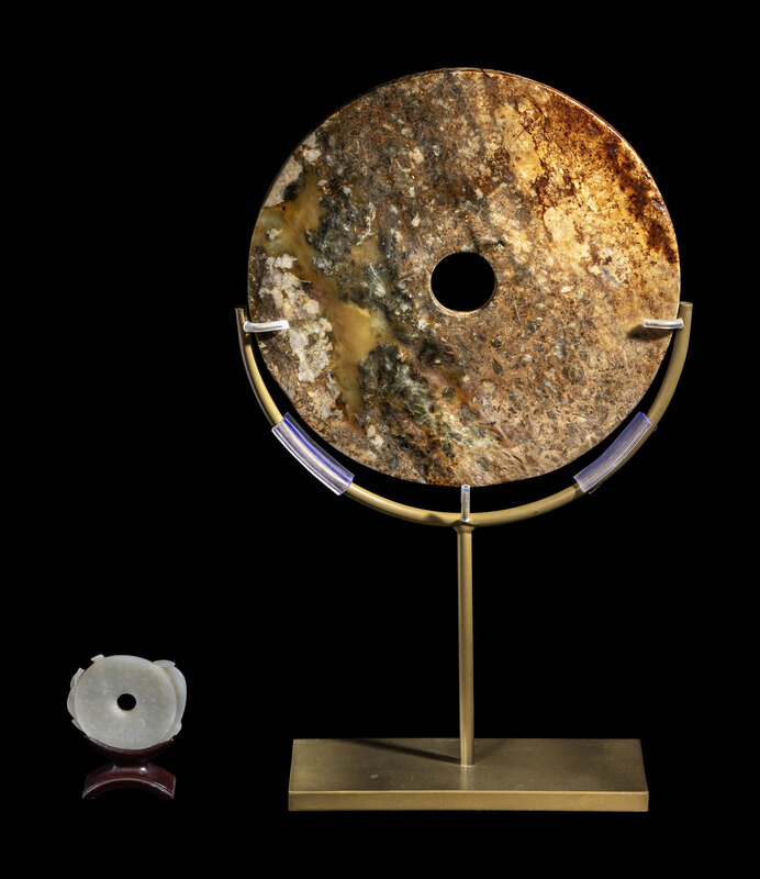 consist of two jade discs, the larger one of a beige color in an archaic style, the smaller white jade disc decorated with two chilong, and scroll motifs to the reverse, both with round aperture to center, with stands.