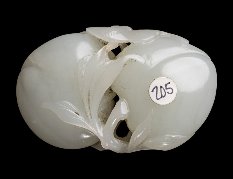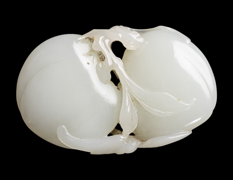 the even-colored stone carved to show two large peaches borne on a leafy stem.