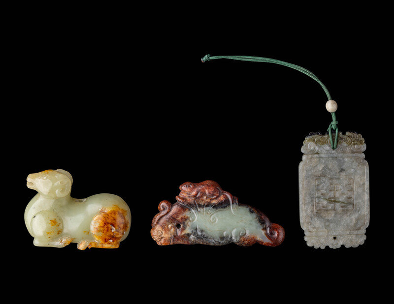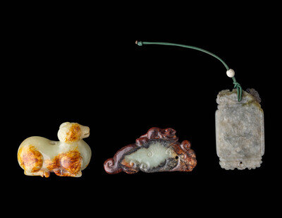 the first a rectangular mottled jade pendant carved with lotus and a 'double happiness' character; the second a russet and celadon jade figure of a recumbent ram; the third a russet and celadon jade pendant in the form of a mouse riding on a mythical beast.
