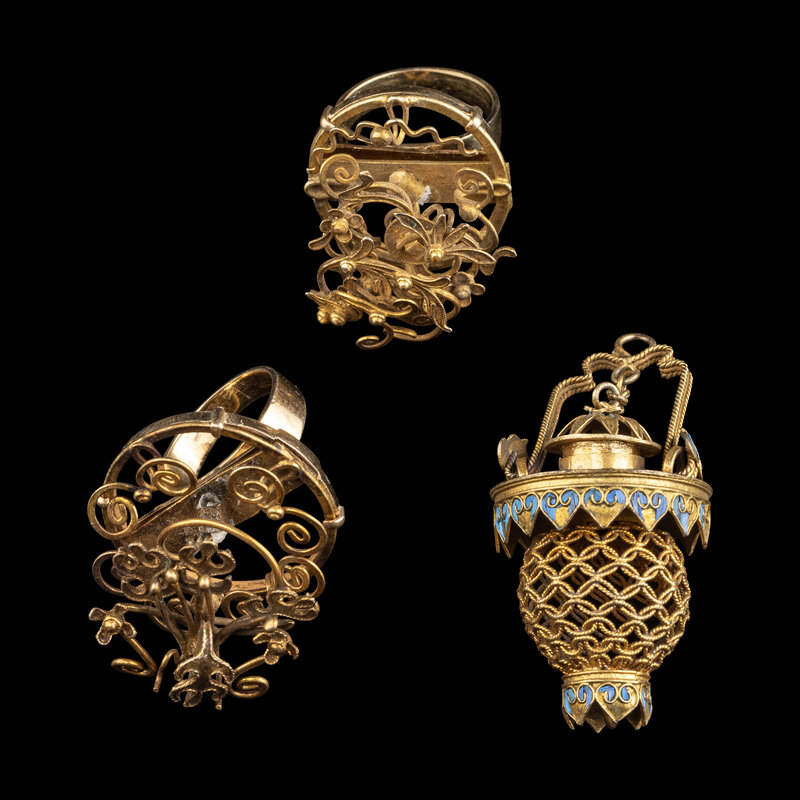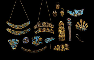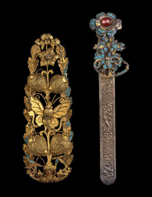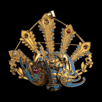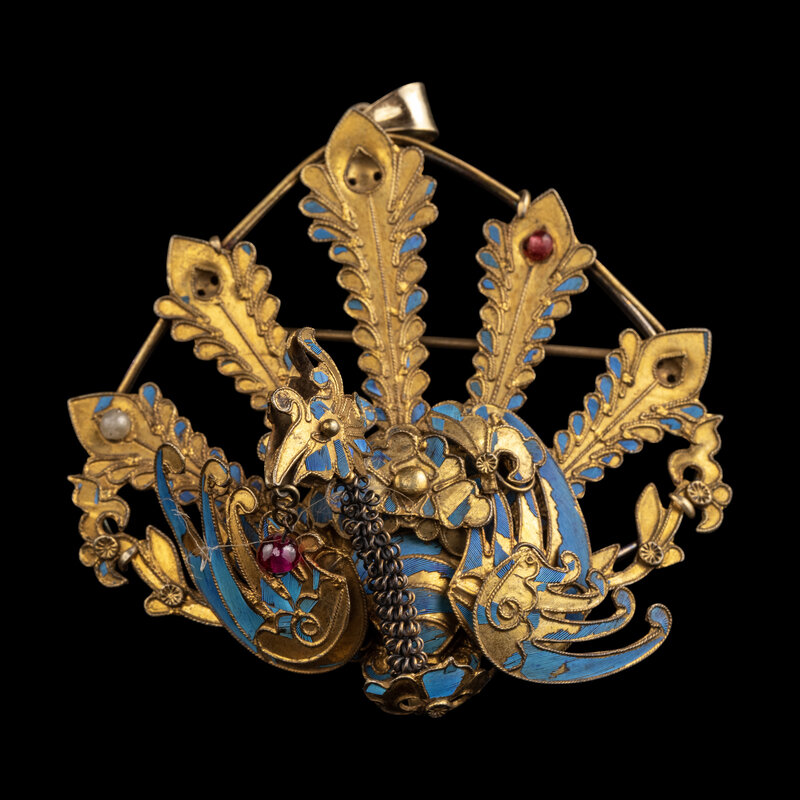 comprising three hairpins, two rings, seven hair ornaments mounted as brooches, two hair ornaments mounted as pendants and two individual hair ornaments.