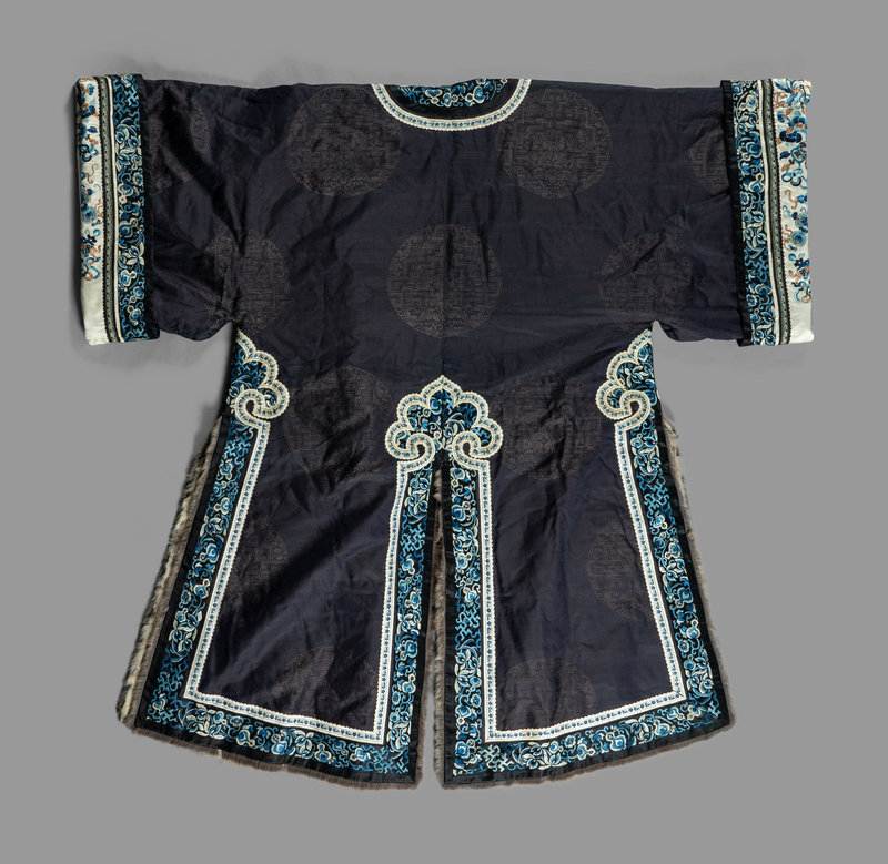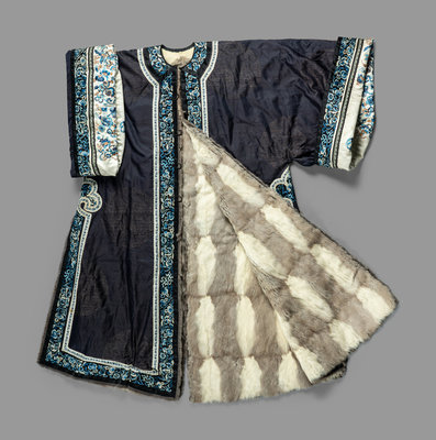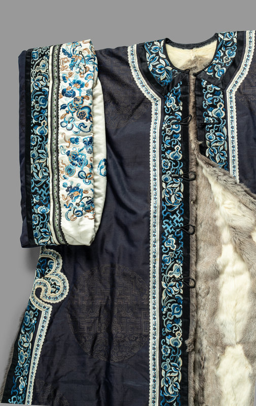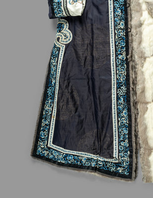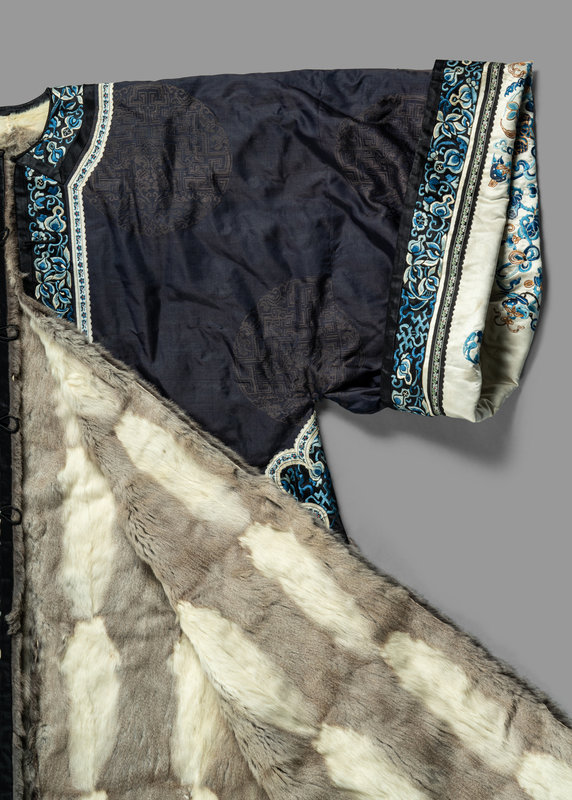 tailored from deep blue silk woven with patterns of stylized foliage and scrolls interspersed with roundels trimmed at the collar, central opening, cream silk padded cuffs, and ruyi form side vents with bands of floral trim worked in shades of 'three blues'. The interior is fully lined with squirrel pelts arranged to to create alternating vertical stripes of cream and fawn peeking out the cuffs and collar.