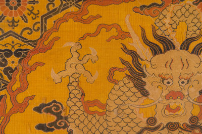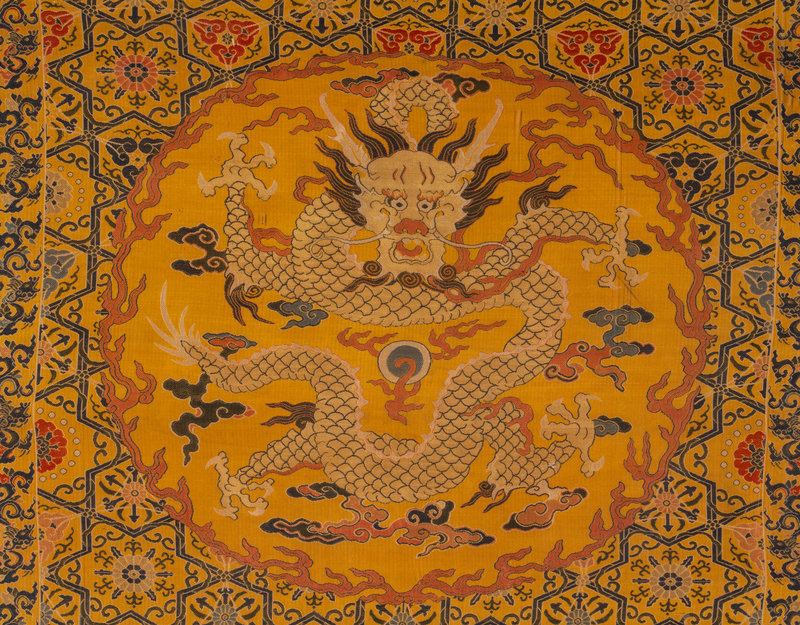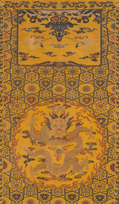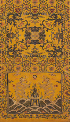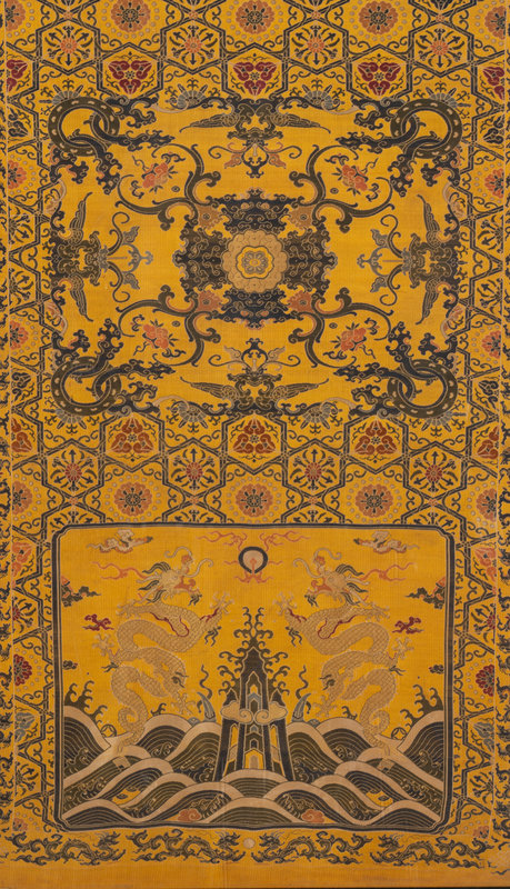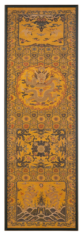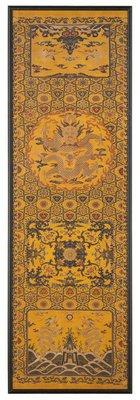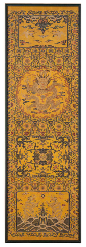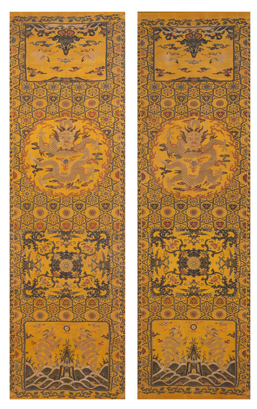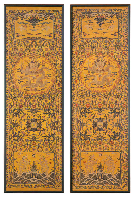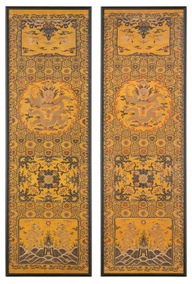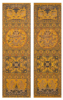 each rectangular panel isworked of golden yellow with vertically organized rectangular and circular reserves showing dragon and lotus against a lozenge diaper ground.