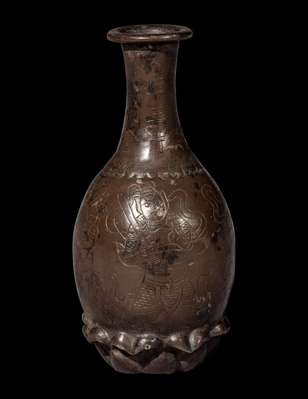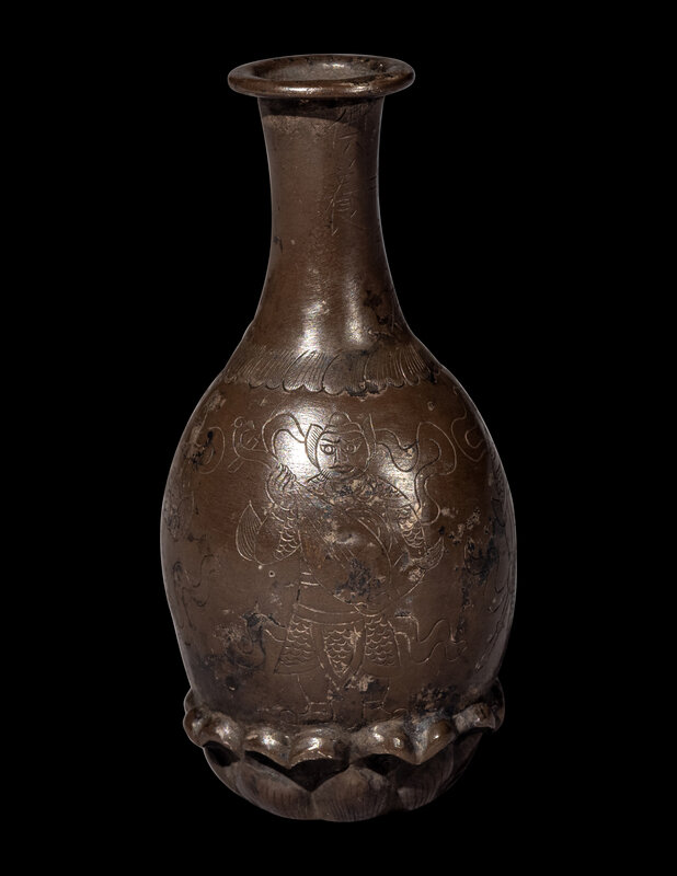 the ovate body shaped above an integral petaloid base, incised with figures, the shoulder with band of veined leaves, inscription at the neck.