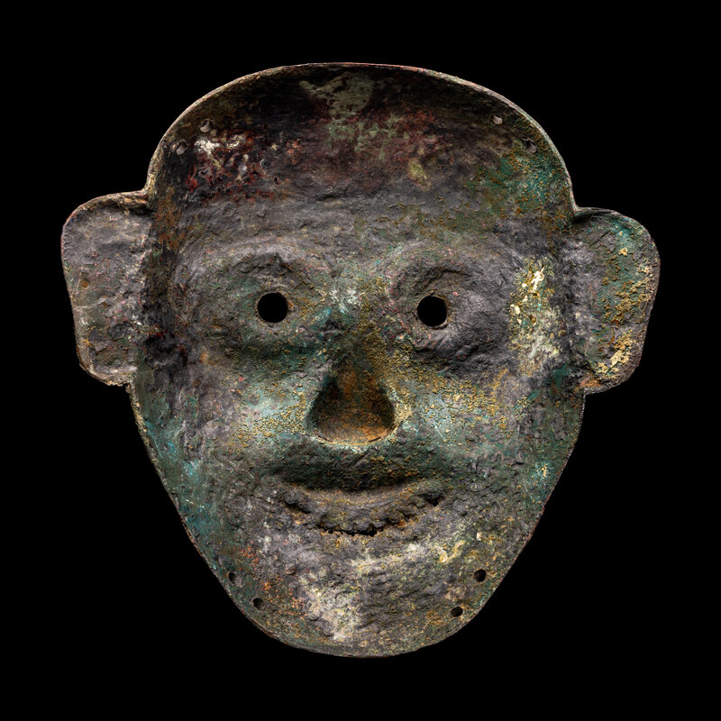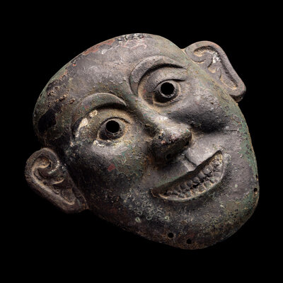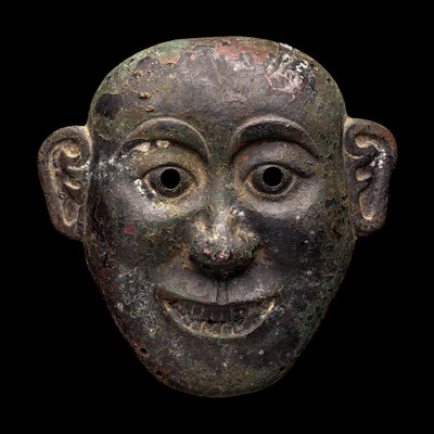 cast with a smile, depicting a pair of arched eyebrows above circular eyes and high cheekbones, the mouth open revealing the teeth.