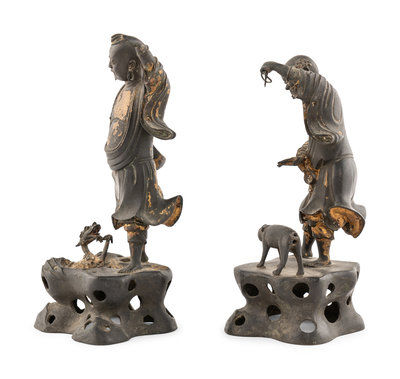 each cast standing above a rocky pedestal base, wearing loose-fitting billowing robes, posed in active gestures engaged with attendant beasts, gilt details concentrated to their chests, legs, and robes.