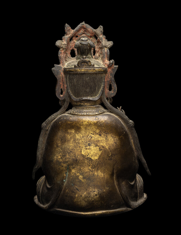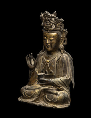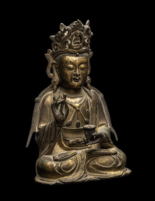 the figure cast seated in dhynasana, the left hand bearing a cup, the right hand holding a stem, wearing draped robes and an elaborate crown.