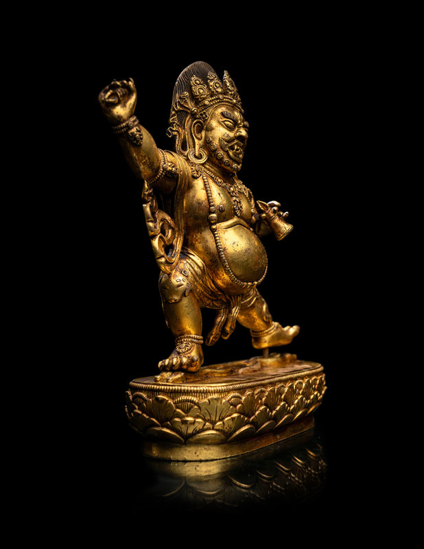 depicted standing in alidhasana, the figure heavily adorned in jeweled ornaments, tiger skin, and a five-skull crown engulfed in flames, and raising in his left hand his ritual vajra.