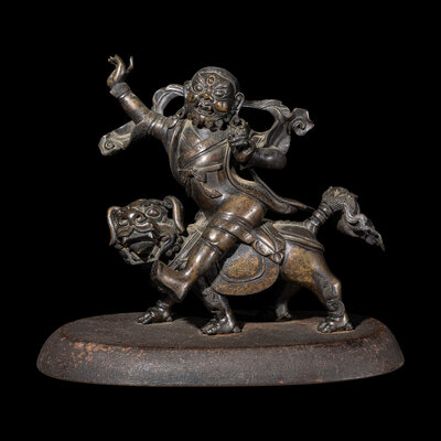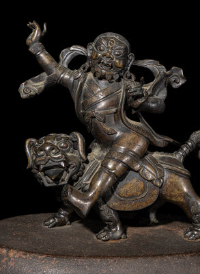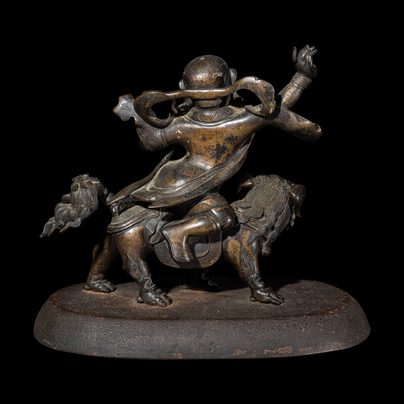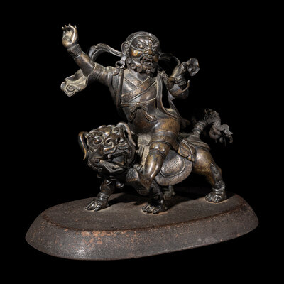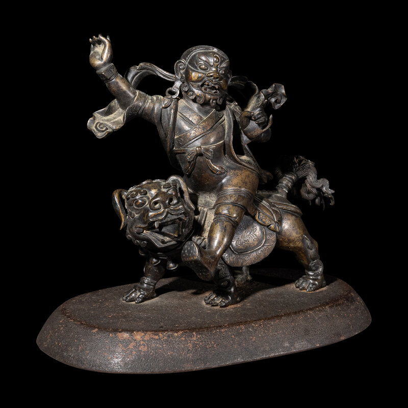 the wrathful figure depicted riding on a roaring fu lion, dressed in draped robes with a flowing celestial scarf, the face cast with a fierce expression, raised on a later stand.