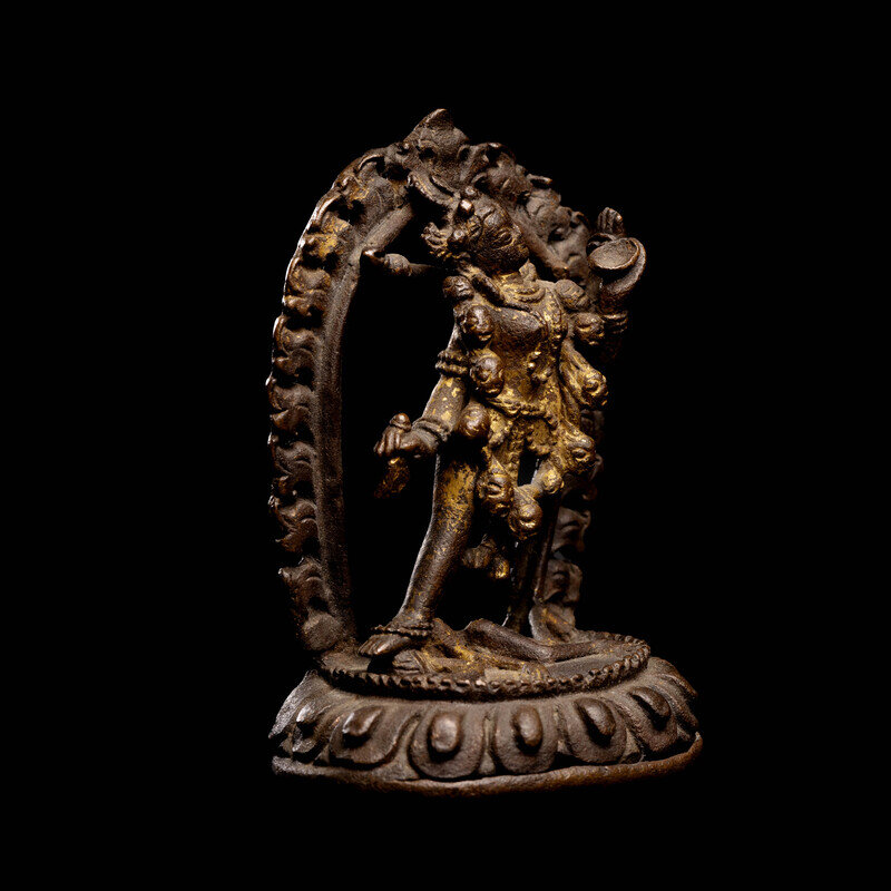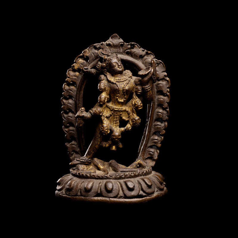 the deity cast with her left leg raised, the right leg stepping onto a lying figure, further raised on a lotus base, her left hand bearing a skull cup, the right hand holding a vajra, wearing a long garland of skulls, backed by flame-form mandala.