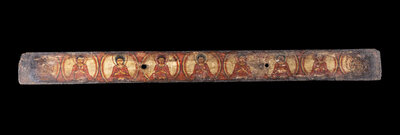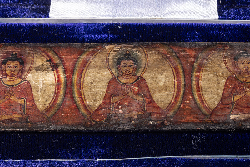 depicting seven teaching Buddhas, with hands in dharmachakramudra, wearing diaphanous red uttarasangha, and maroon antaravasaka showing at the ankles, seated in vajraparyankasana, the heads with alternate red and blue halos, each with rainbow-edged prabhamandala, all set on a monochrome red background, with seated deities at either end wearing bodhisattva jewelry and fluttering scarves, seated in vajraparyankasana with similar prabhamandala and partially obscured by natural accretion from handling during ritual use.