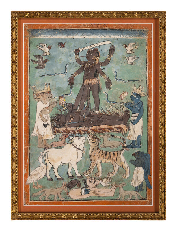 centered with a standing four-armed deity surrounded by attendants, birds, and animals, framed.