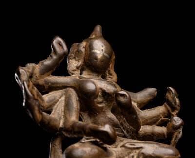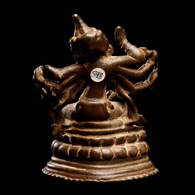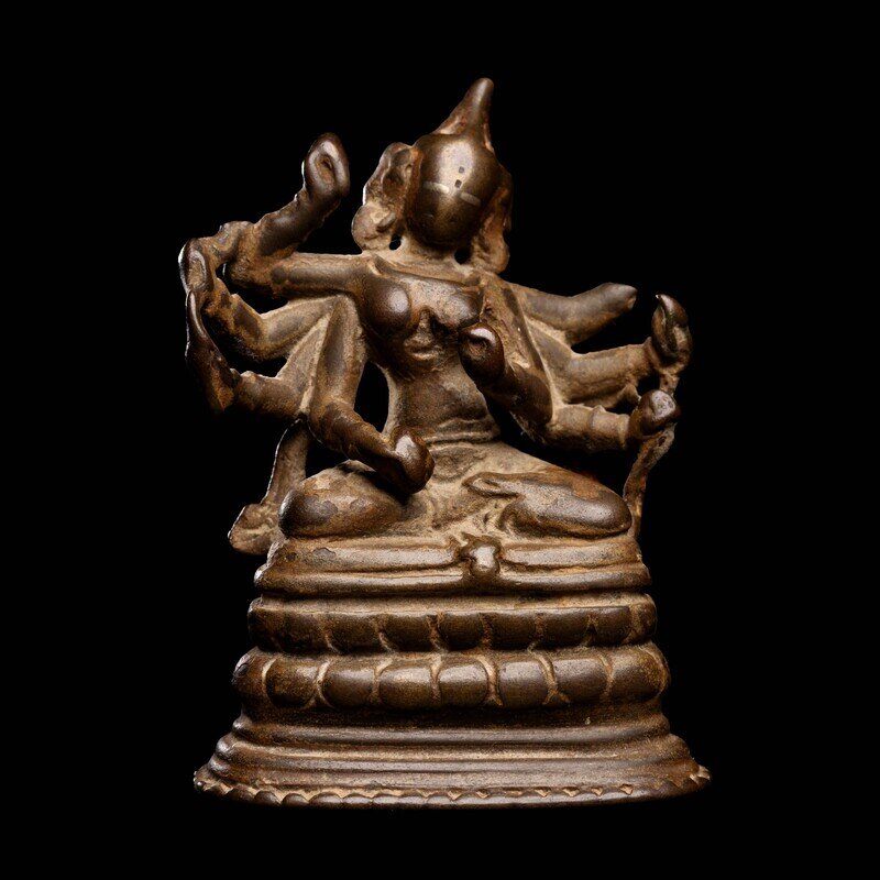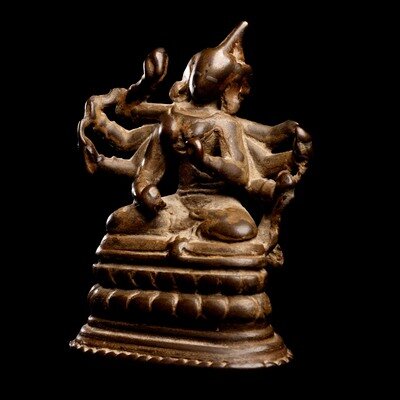 the deity cast seated in dhynasana on a double lotus plinth, various arms bearing attributes.