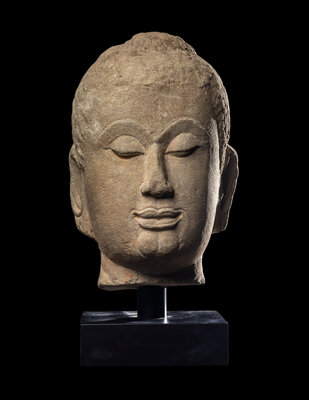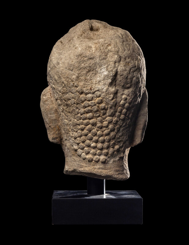 the face carved with a subtle smile, the arched eyebrows above a pair of downcast eyes, an aquiline nose and full lips, framed by elongated earlobes and right knots, raised on a later stand.