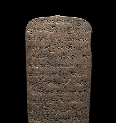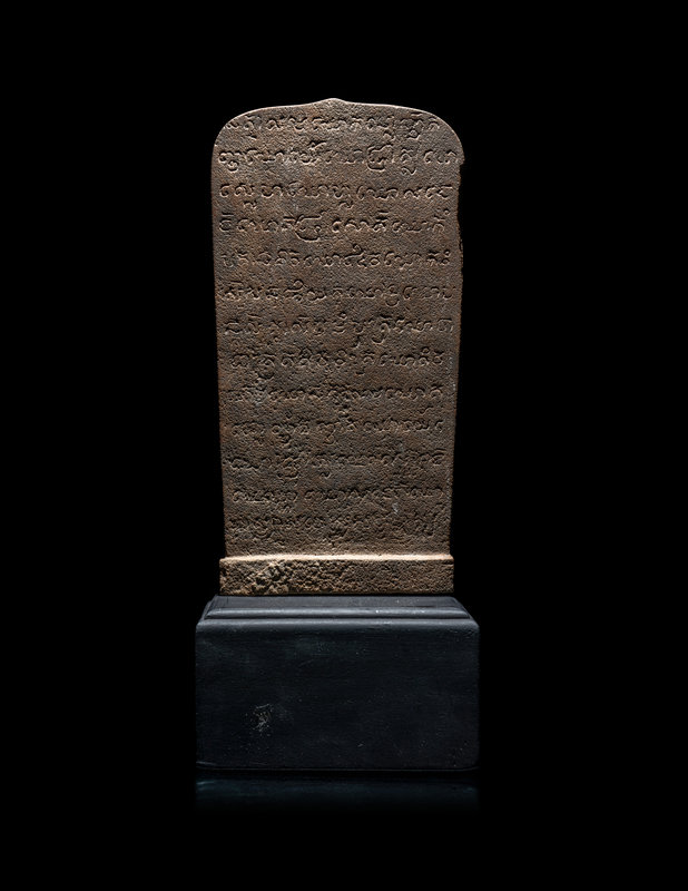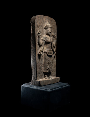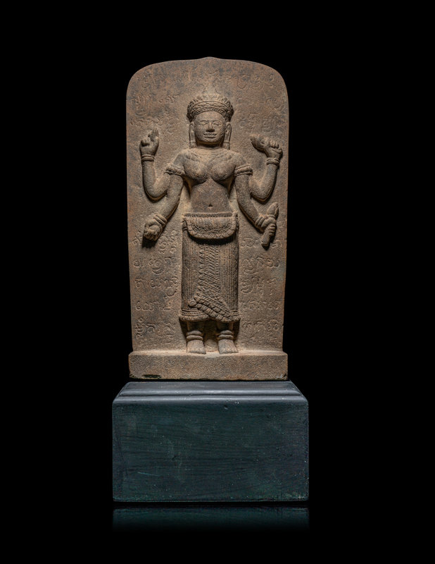 the rectangular panel with a lobed top carved in relief to show standing Vishnu, the front and back inscribed in Khmer script.