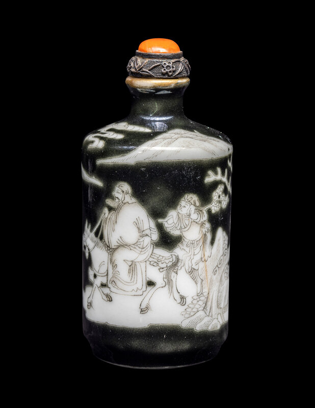 of straight cylindrical form with angular shoulders and a waisted neck, decorated with a continuous scene of riders traversing a landscape, the mouth gilt, coral-inset oxidized metal stopper.