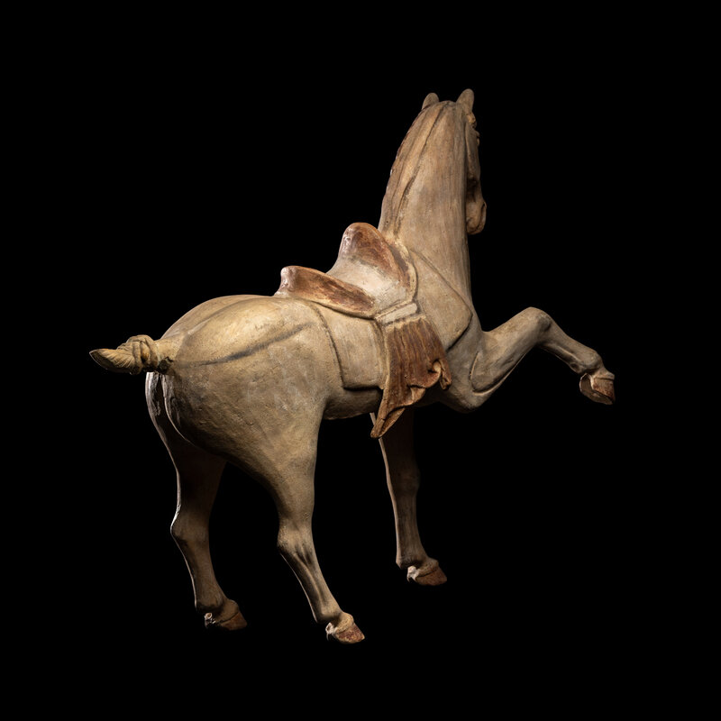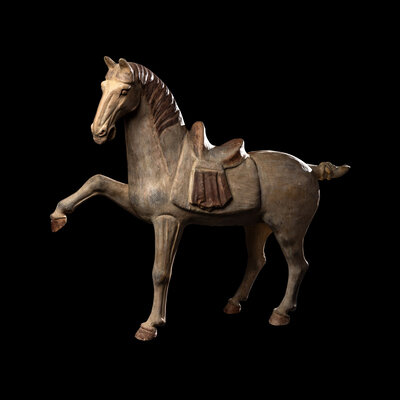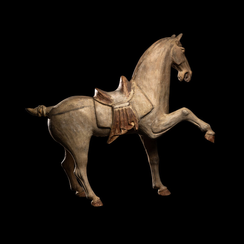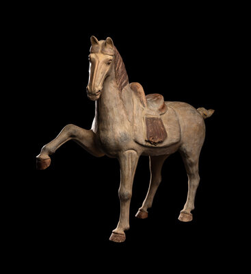 powerfully modeled standing on three muscular legs with the right forefoot held aloft, the neck straight, mouth agape and ears piqued, painted with auburn details at the draped saddle and hooves.