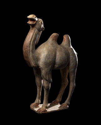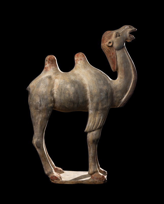 molded standing foursquare atop an integral rectangular base, with sculpted and incised details shaping sinewy legs and a thick mane, the tail brushed left as the fixed gaze trains in the same direction as its curling upper lip, painted with taupe, auburn, and black details.