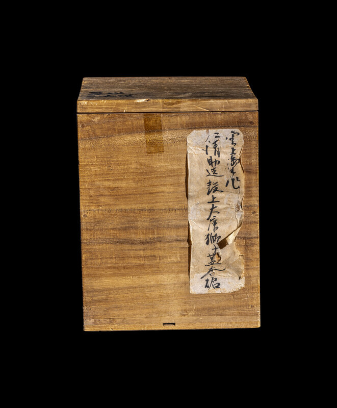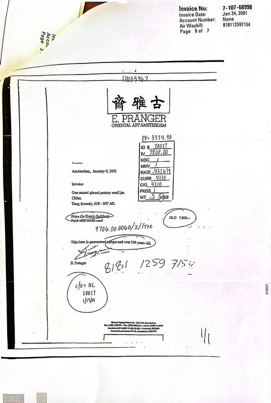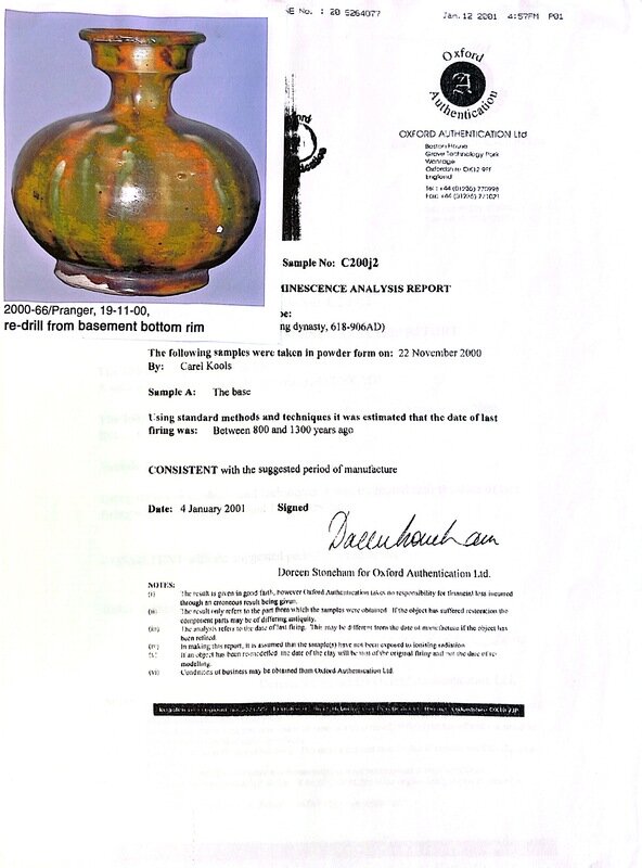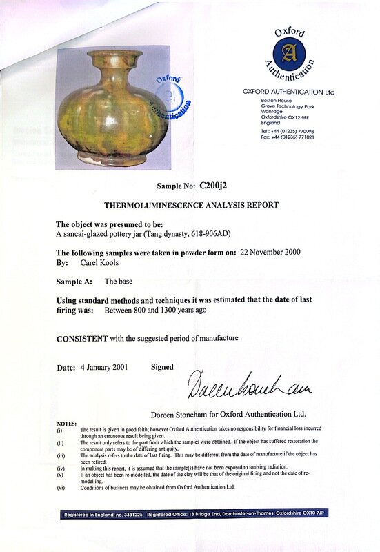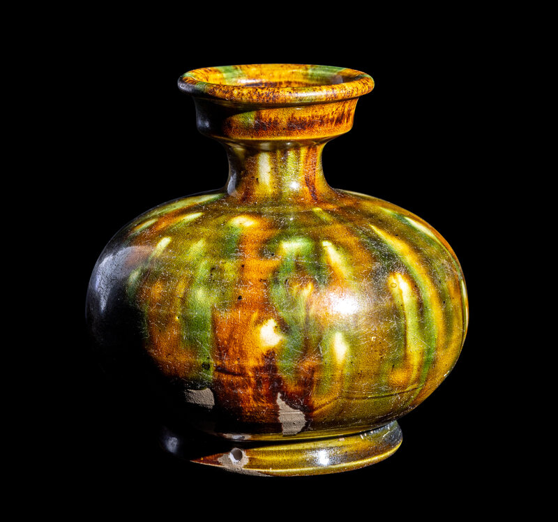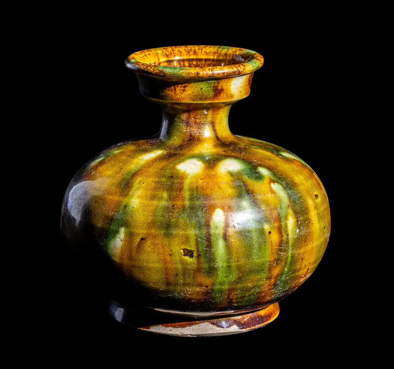 the compressed globular body resting on a short spreading foot, surmounted by a slightly waisted neck and a cup-shaped mouth, the exterior covered in a splashed glaze of green, dark, and yellowish amber color, the underside unglazed revealing the pale body.