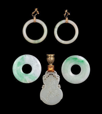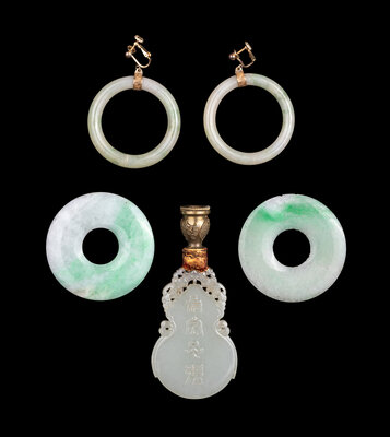 comprising a pair of jadeite loop-form earrings, a pair of jadeite bi discs, and a gourd-form jade pendant mounted as lamp finial.