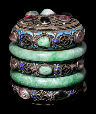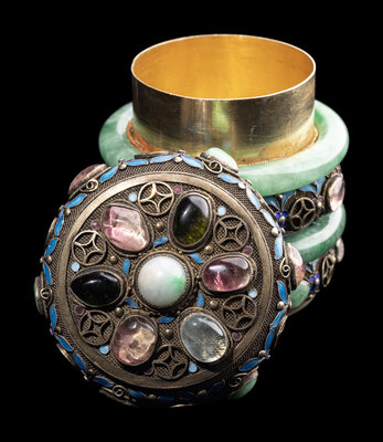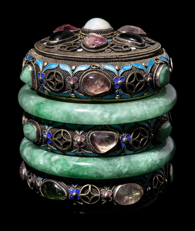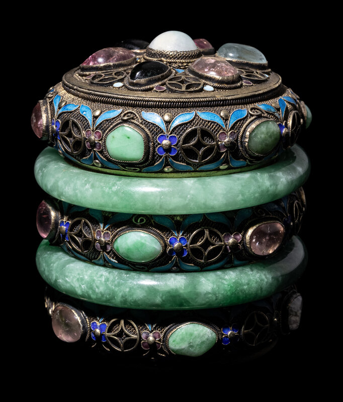 comprising two apple green jadeite bangles mounted to forms the sides of the cylindrical box.