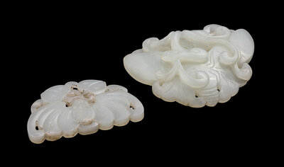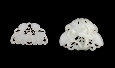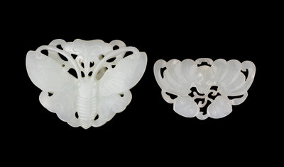 the first carved to show two lingzhi sprigs above a winged butterfly, the second pierced and carved to show a bat flying towards two peaches, each stone of an even tone.