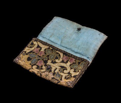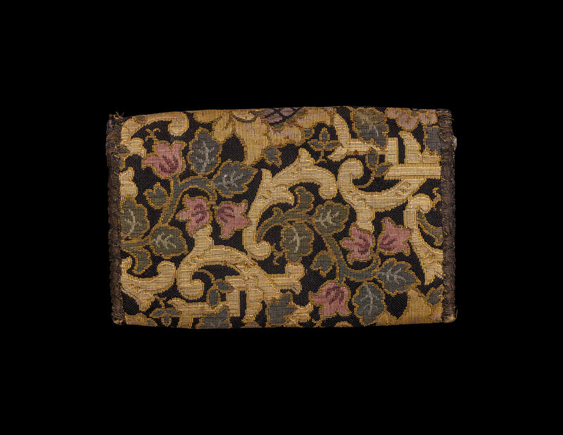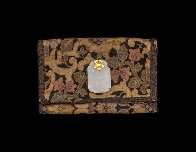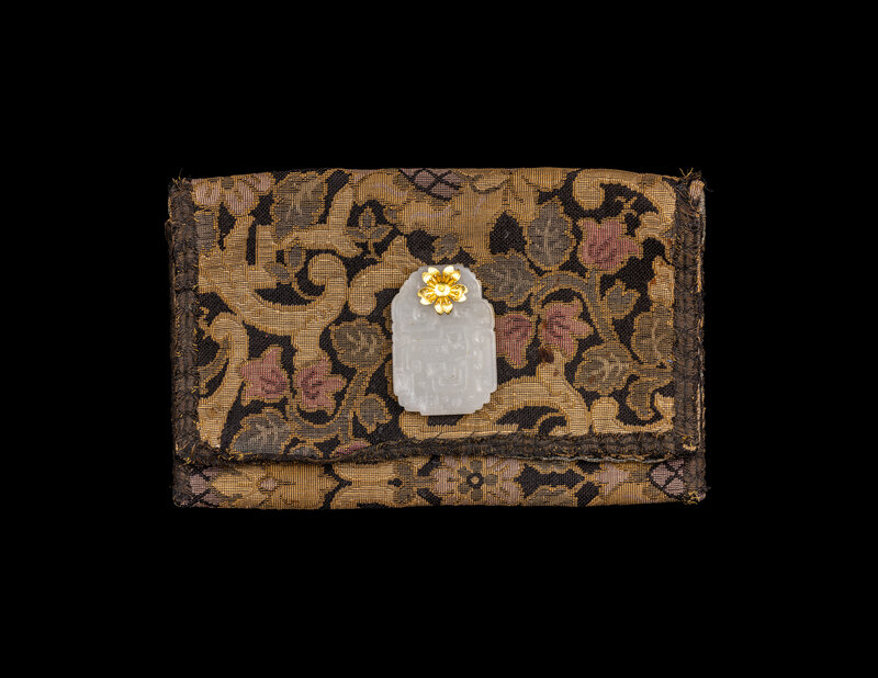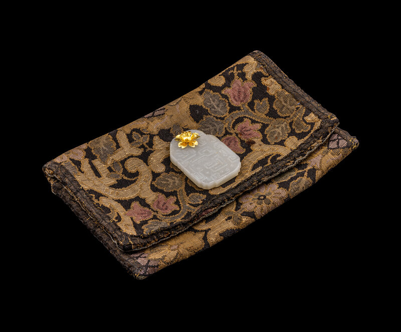 the stone of an even tone, carved in low relief with stylized dragons, mounted on a woven purse.