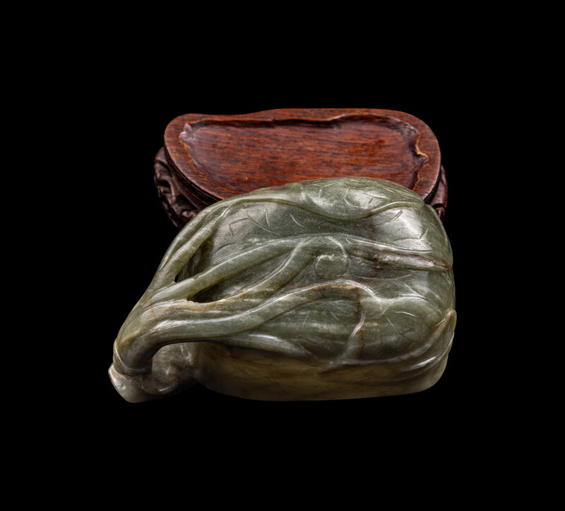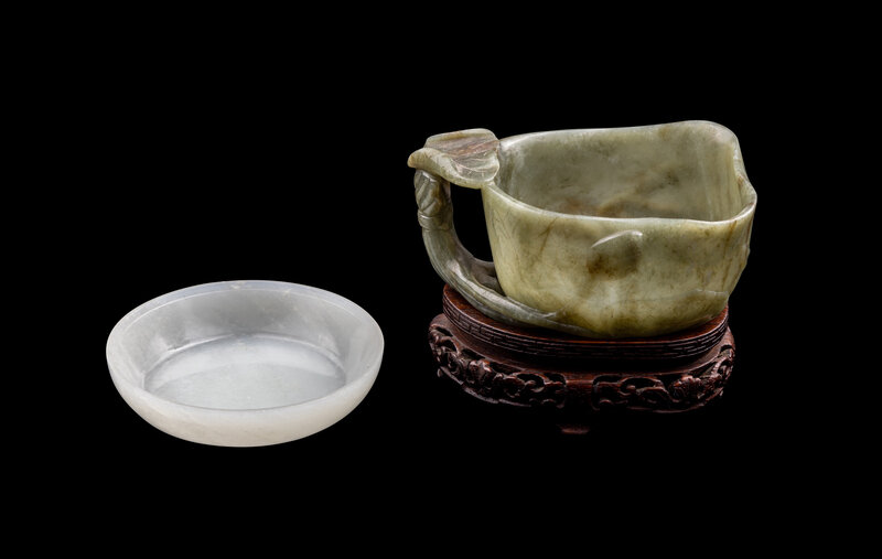 The celadon jade coupe carved in the form of lotus leaf with a lotus stem form, with a wood stand, and a white jade cover with a "Shou" character to the top