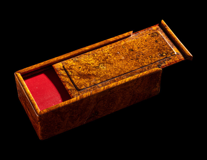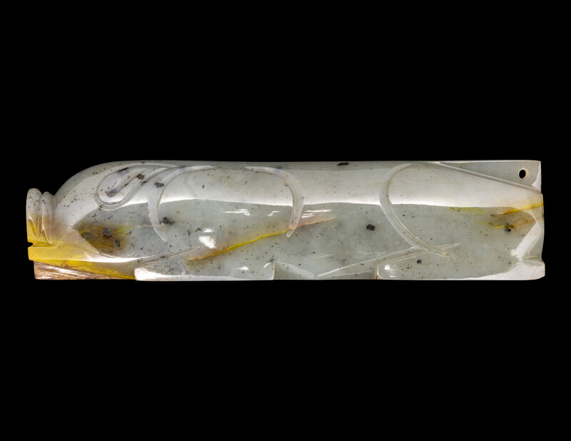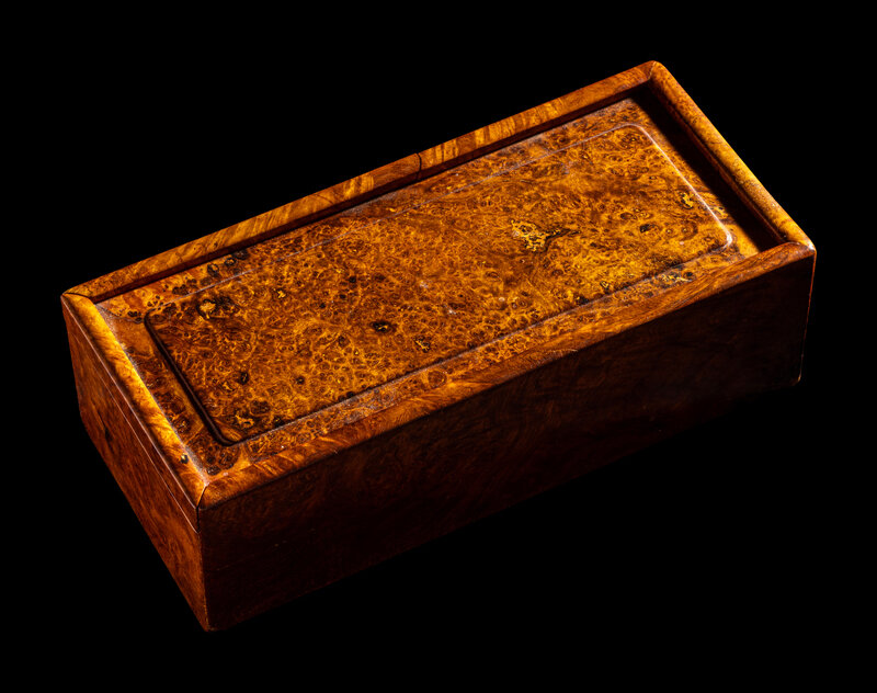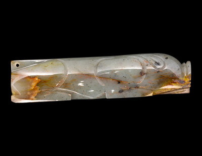 depicted recumbent with incisions marking pointed ear, snout, and haunches, pierced above the hindquarters, the stone of pale tone with grey flecks, inclosed in a padded box burlwood box.