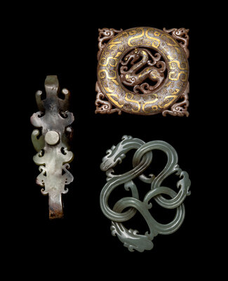 the first a russet and celadon jade 'chilong' belt hook, the second a pale celadon pendant of a crouching chilong, the third a white jade chilong bi disc.