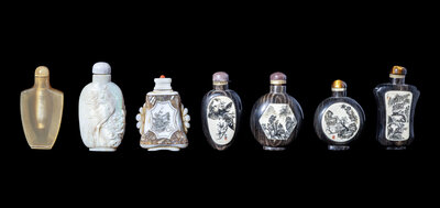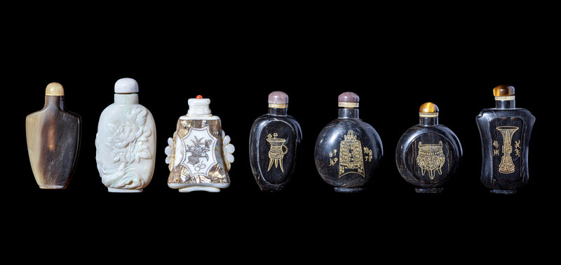 comprising a carved opal example, a mother-of-pearl inlaid example, a buffalo horn example and four gilt highlighted wood examples.