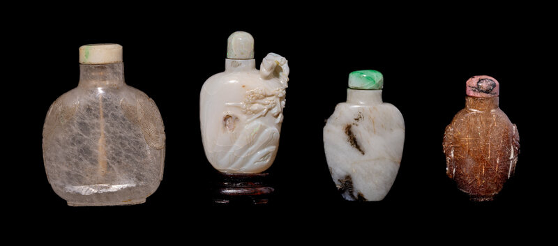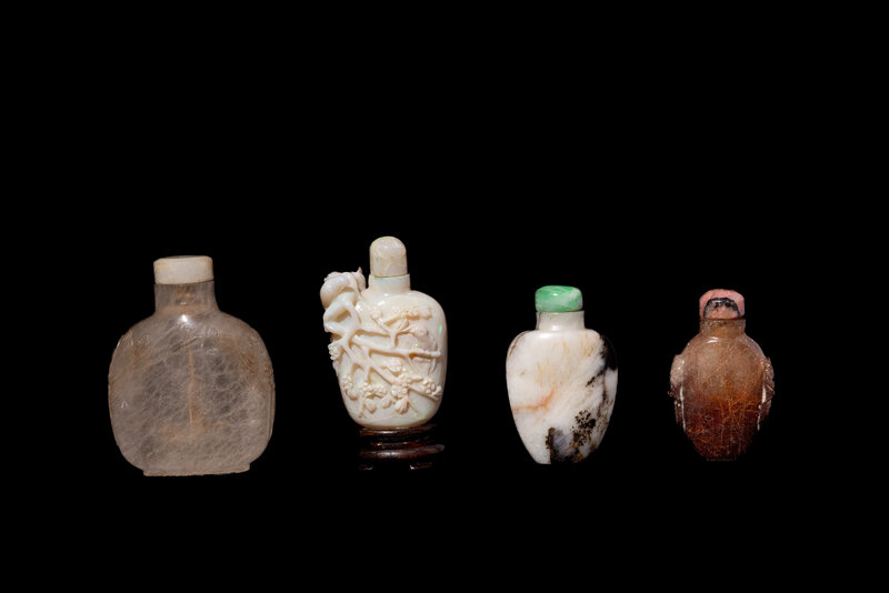 comprising a rounded rock crystal example, a flattened white and black jade example, a carved opal example and a carved quartz example.