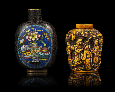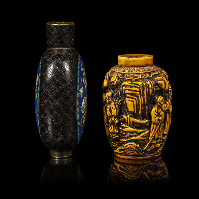 comprising a carved bone baluster-form example, carved with scholars; a cloisonné enamel flattened-form example decorated with bogu motif.