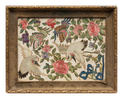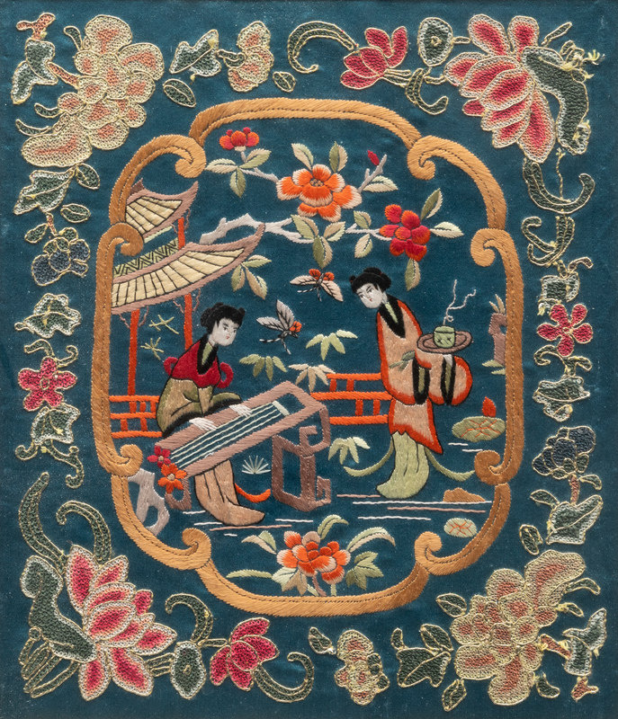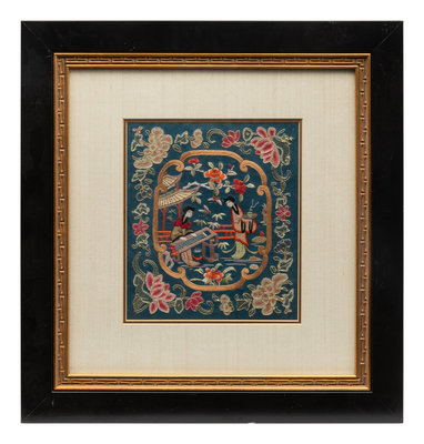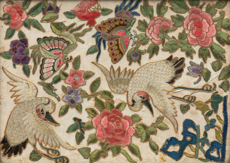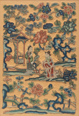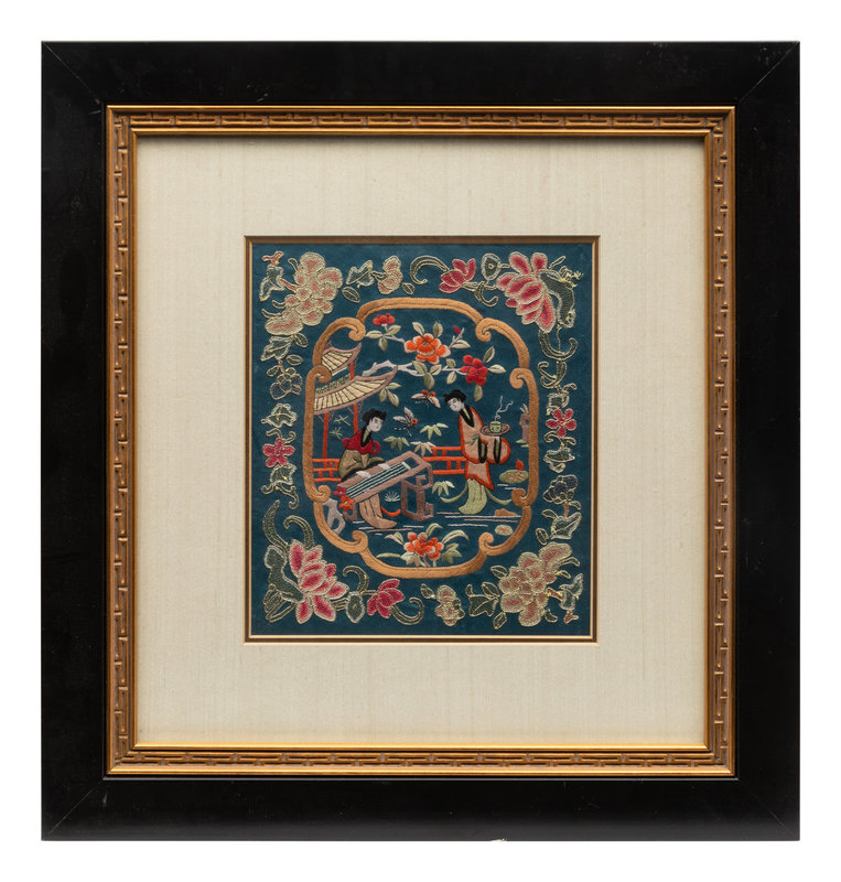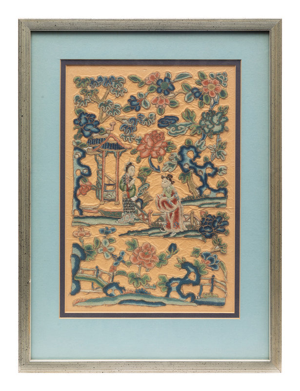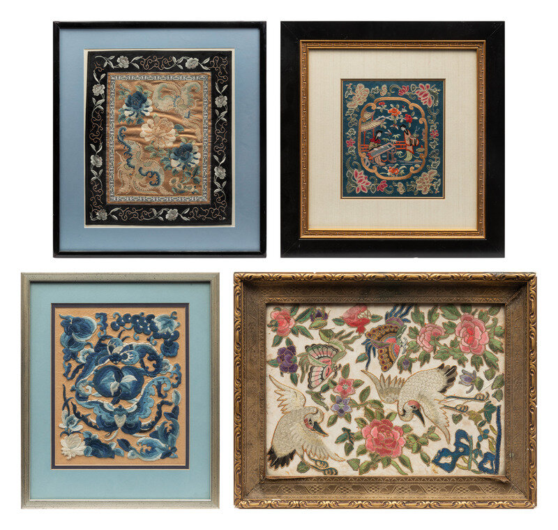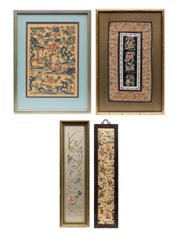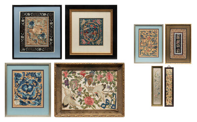 comprising two peach ground examples embroidered with seed stitches to show bats and peony, one blue ground example worked in polychrome and gilt threads to show ladies meeting within a reserved garden, a larger cream ground sample worked in gilt outline with cranes, two sleeve bands, one sample worked with couched threads and seed stitches to show figures, and a black satin ground ribbon, each framed.