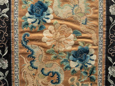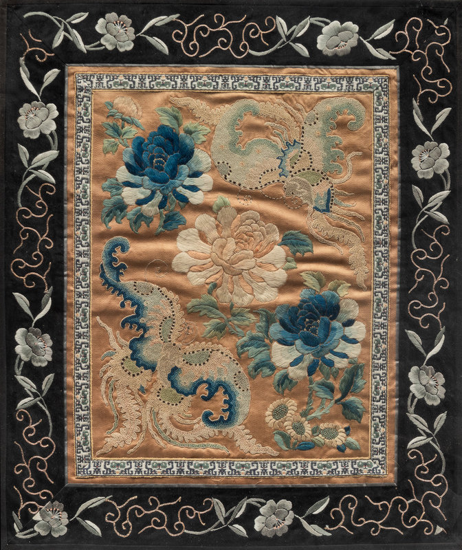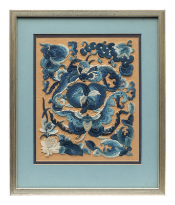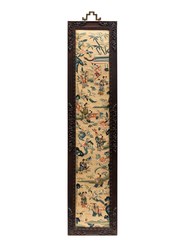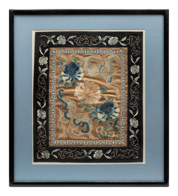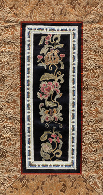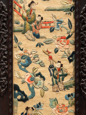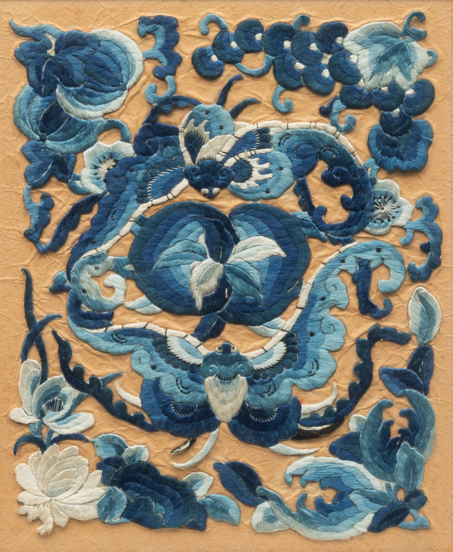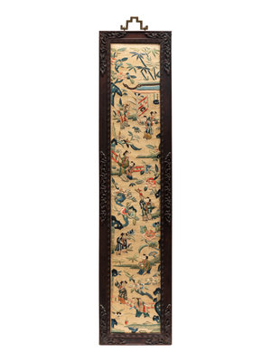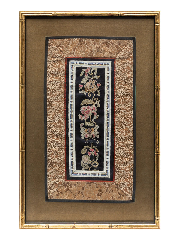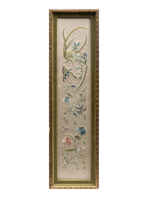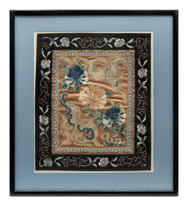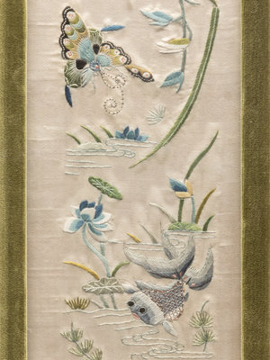 comprising two peach ground examples embroidered with seed stitches to show bats and peony, one blue ground example worked in polychrome and gilt threads to show ladies meeting within a reserved garden, a larger cream ground sample worked in gilt outline with cranes, two sleeve bands, one sample worked with couched threads and seed stitches to show figures, and a black satin ground ribbon, each framed.