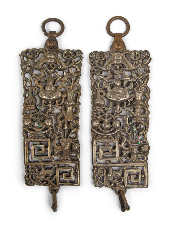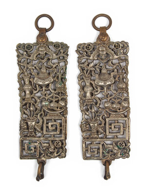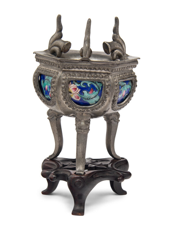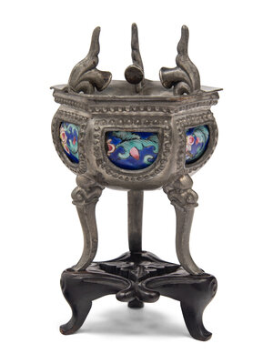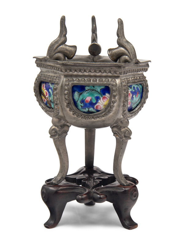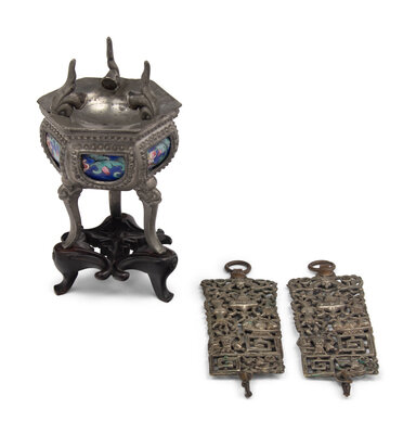 comprising an enamel on pewter tripod censer, and a pair of silver rectangular plaques decorated with bogu motif.