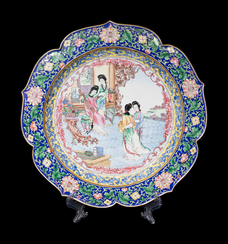 comprising three vases painted with birds and flowering plants, an offering plate decorated with ladies in an interior scene.
