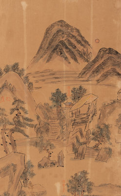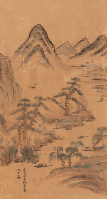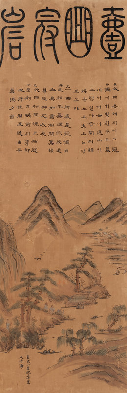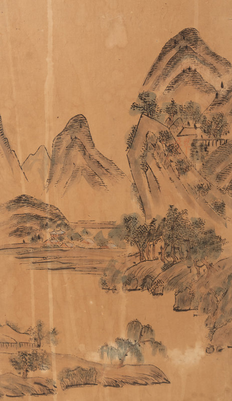each panel painted in ink and color on paper, showing a landscape scene underneath inscriptions.