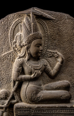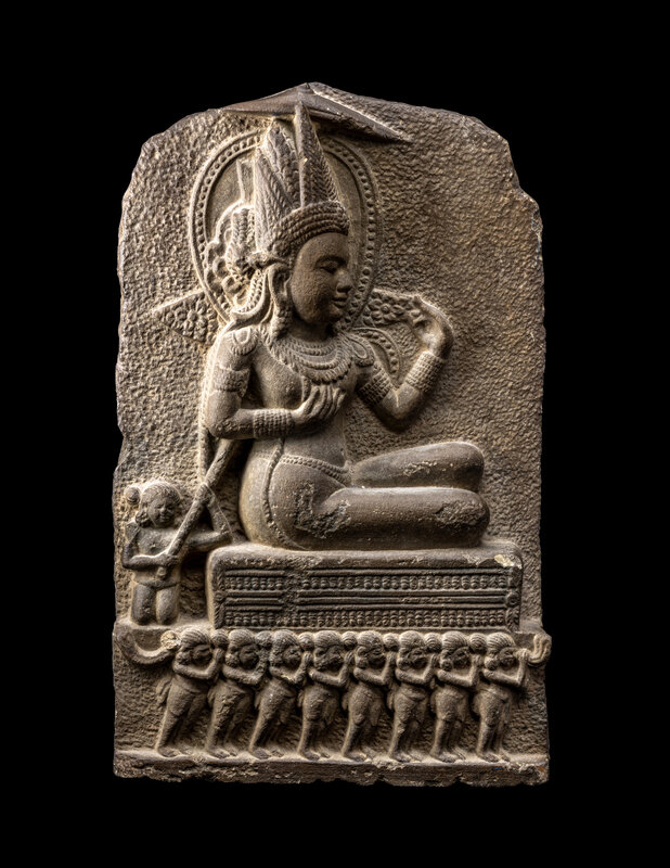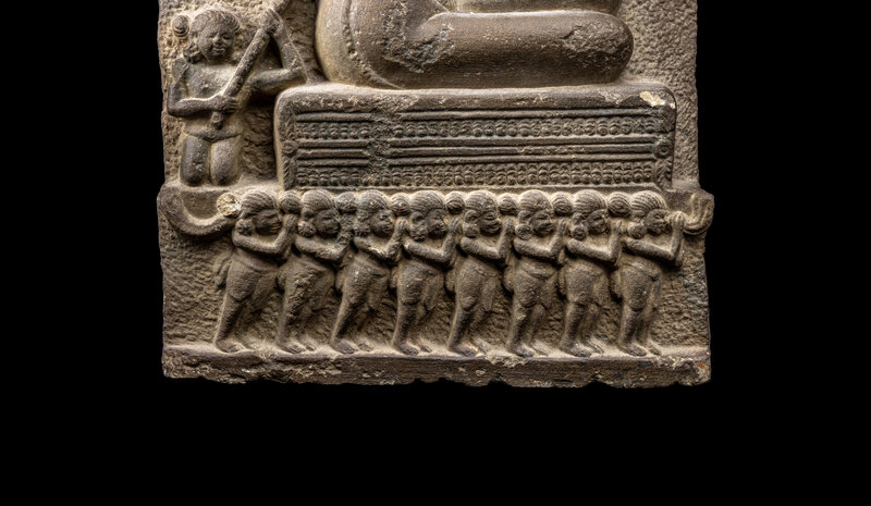 carved to the front in relief depicting a deity seated on a cushion, being carried by numerous smaller figures.