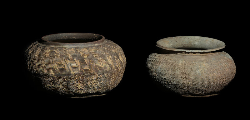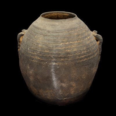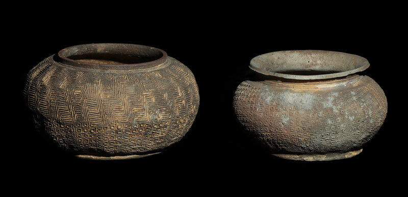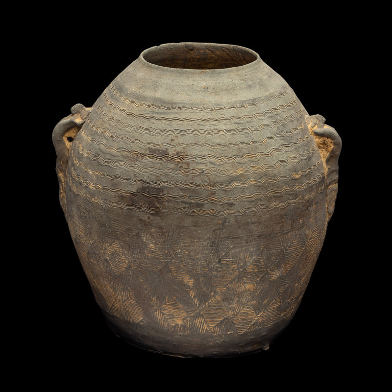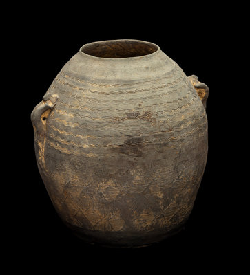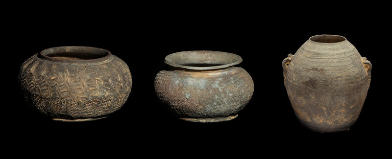 the Eastern Zhou example and the Warring State example each of compressed globular form topped with a lipped mouth, carved with geometric designs; the large Han example having a baluster body, carved with wave motif above woven design, the shoulder applied with a pair of stylized dragon-form handles.