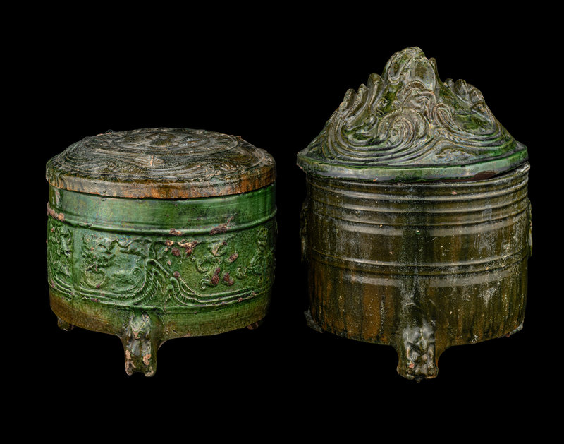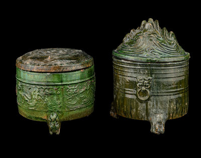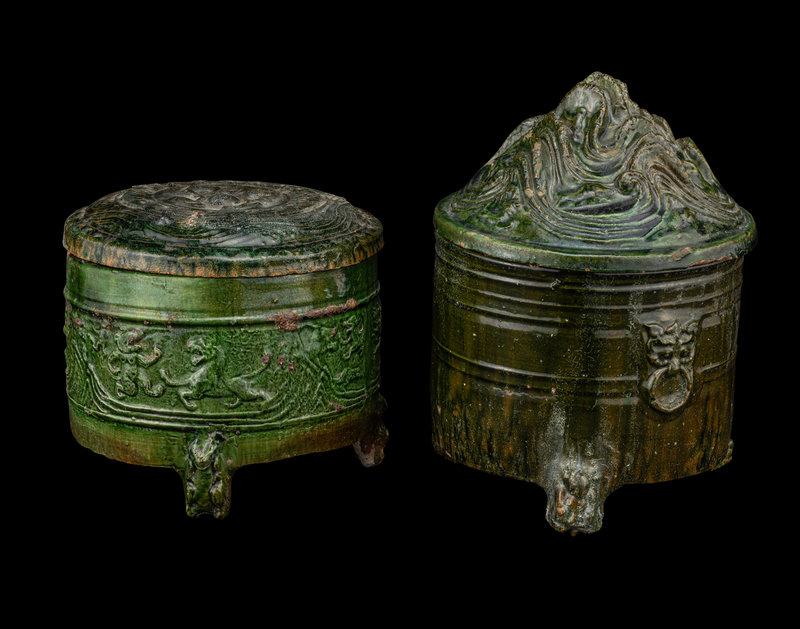 the first a 'hill' censer and cover, the cylindrical vessel raised on three kneeling bear-form supports and molded with concentric rings, the cover molded in high relief with tall mountains; the second another cylindrical censer resting on three legs in the shape of seated beasts, the exterior molded in relief showing dragons and further animal figures.