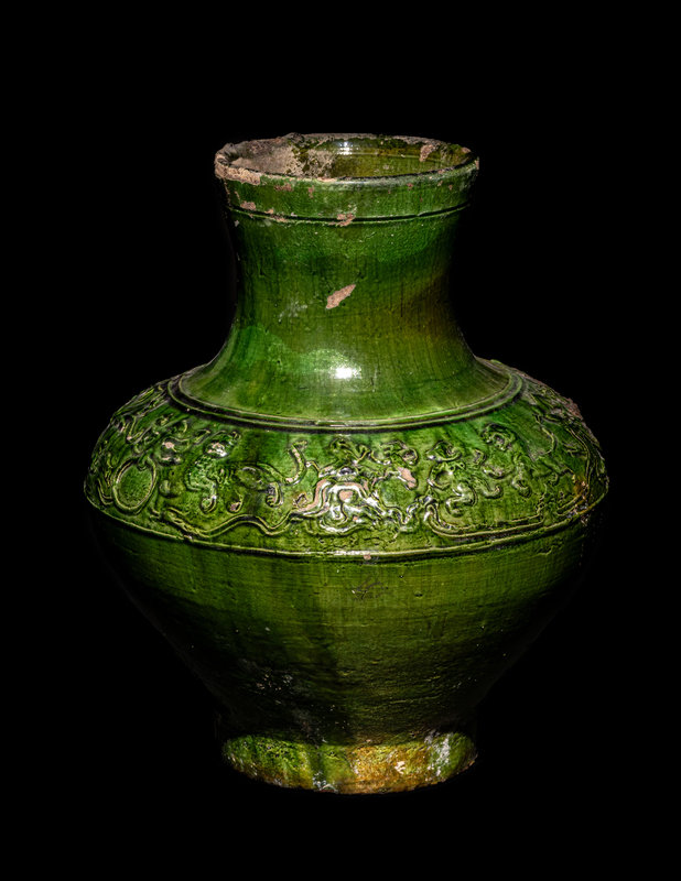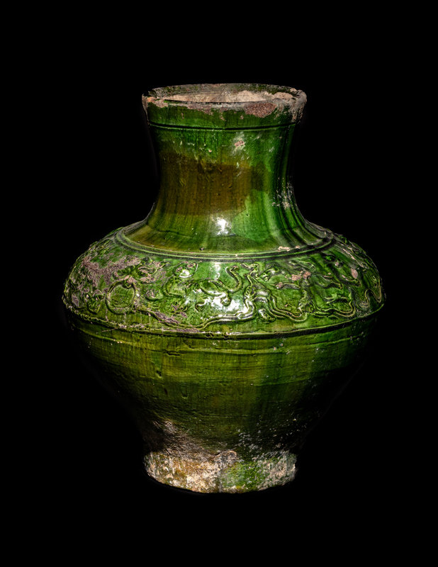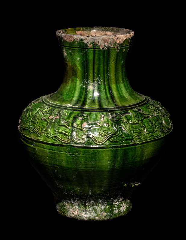 the slightly compressed body rising to a slightly recessed neck, the exterior molded with a band of various animal figures and a pair of beast masks and mock rings.